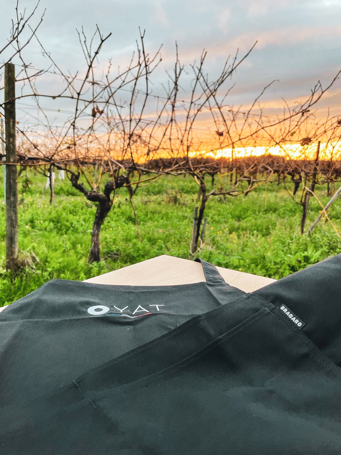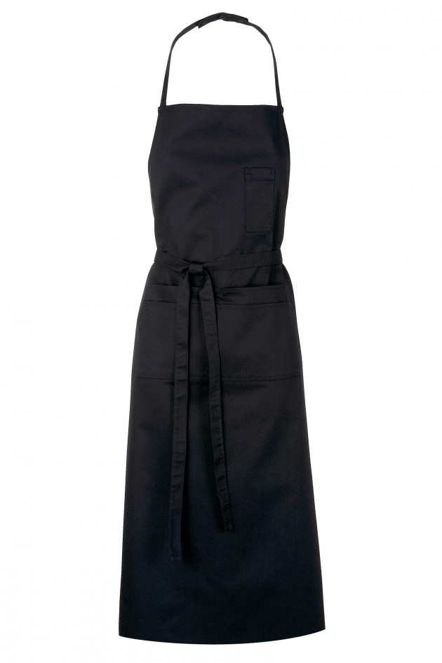 Tablier noir OYAT x Bragard Tablier à bavette réglable au niveau du cou par des boutons pression, tresses à nouer taille. 65% Polyester 35% Coton Longueur : 95 cm Largeur : 100 cm Genre : Mixte